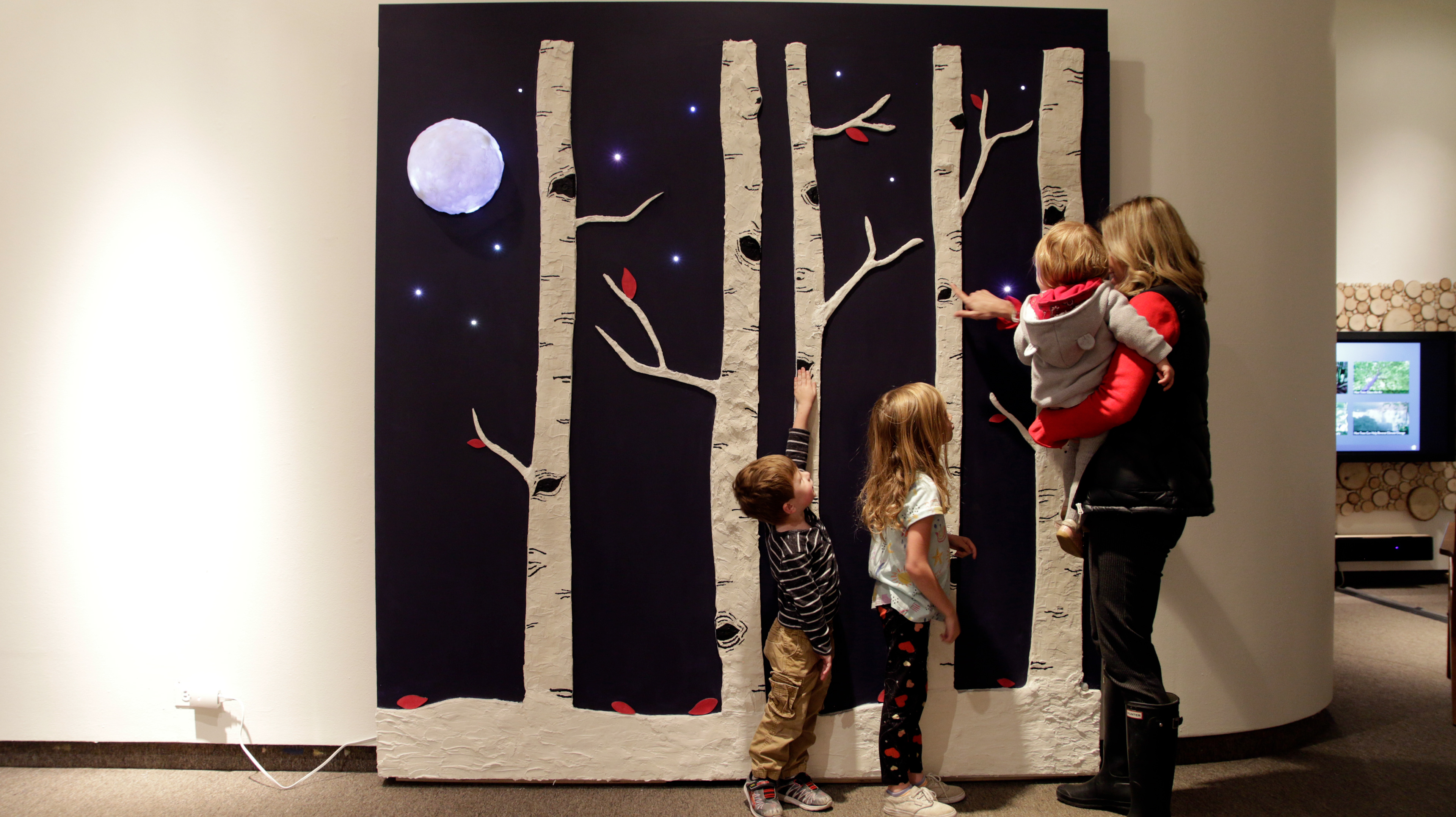 The three main interactions are sound, light, and color. Made from conductive paint, the tree knots trigger connect to Bare Conductive's Touch Board and play realistic forest sounds from mp3 files. These sounds are triggered via capacitive touch. Controlled by an Arduino, the neopixels light up the moon and the stars. When a proximity infrared (PIR) sensory detects motion, it the night sky turns on for thirty seconds. Finally, the leaves are painted with thermochromic paint. At eighty-six degrees Fahrenheit, approximately body temperature, the leaves change from red to yellow. After placing your hand over a leaf for a minute, you will begin to see the leaf change colors. To learn more about my prototyping process please visit my in-progress blog.
